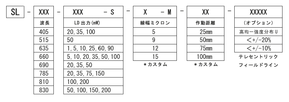 | 波長(nm) | 405, 520, 635, 660, 690, 785, 810, 830 カスタム |